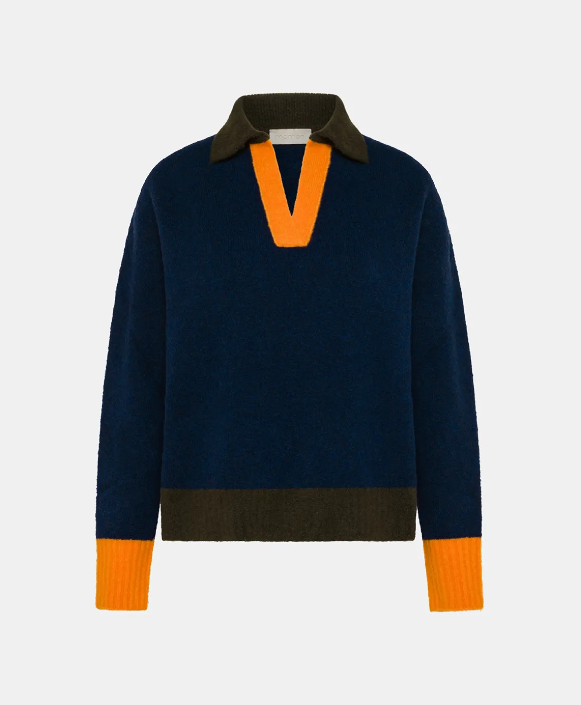 maglia con collo a polo in filato di lana elasticizzata effetto felpa. Particolare gioco di colori a contrasto, a formare dei blocchi sul collo, sui fondi e sui fianchi. Rifiniture a coste alte. Made in Italy