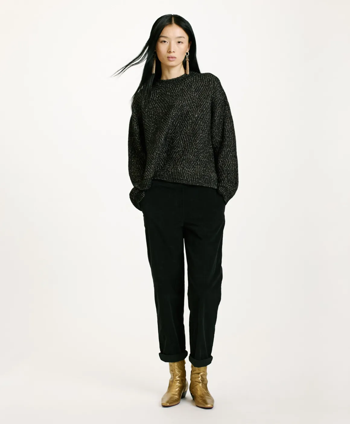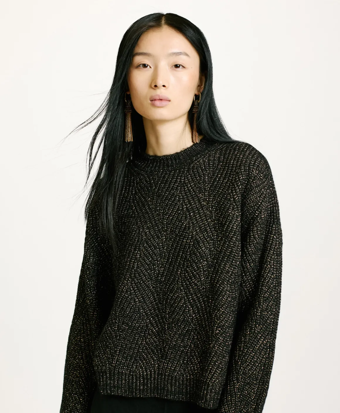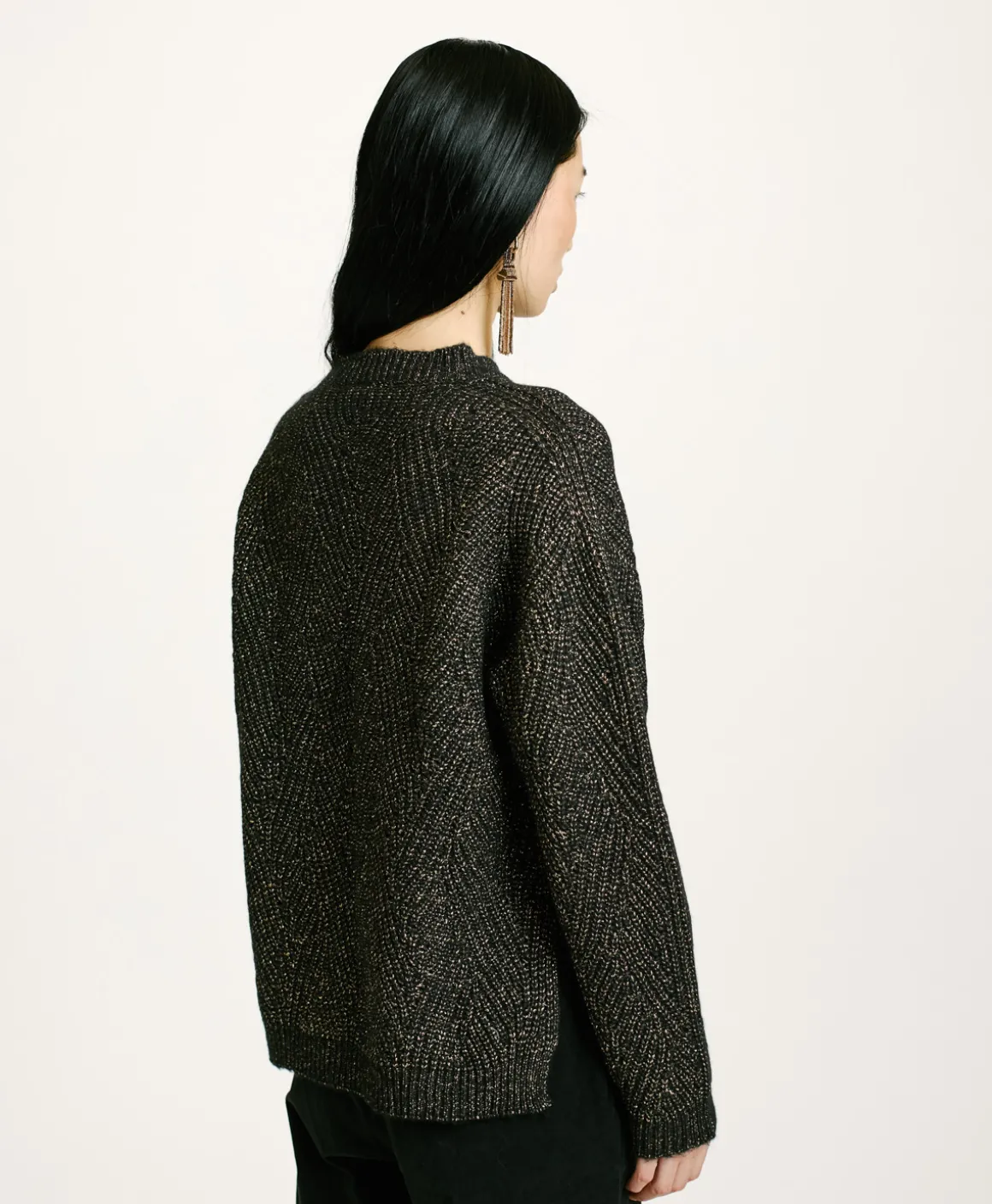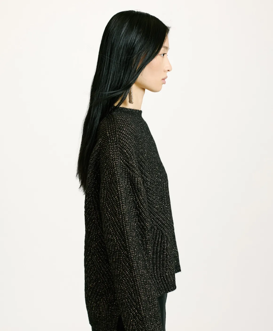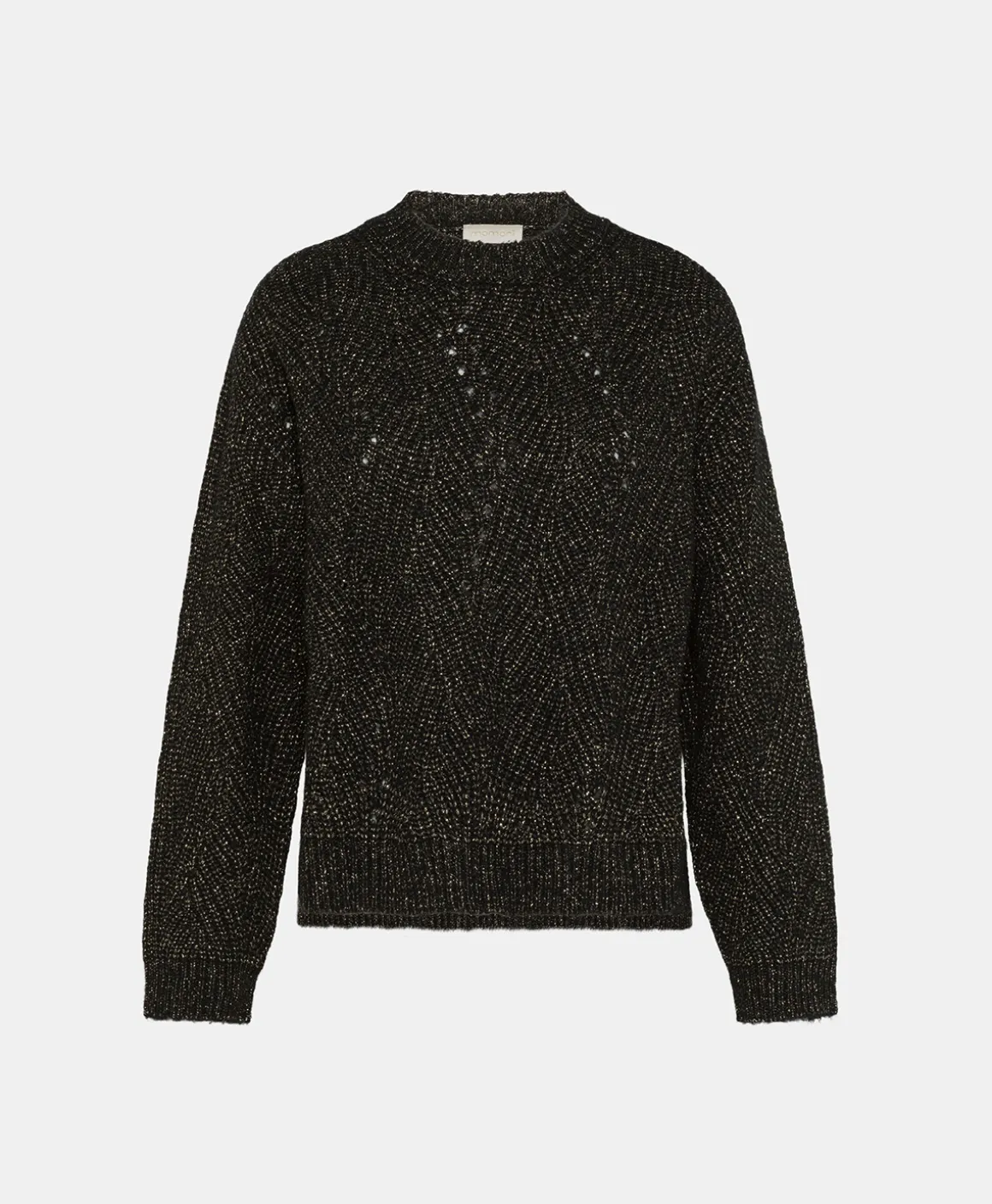 Maglia girocollo con collo a coste con particolare lavorazione a treccia e dettagli punzonature in filato lana vergine con tocchi lurex. Fondo con spacchi e schiena più lunga del davanti. Manica lunga con polso.