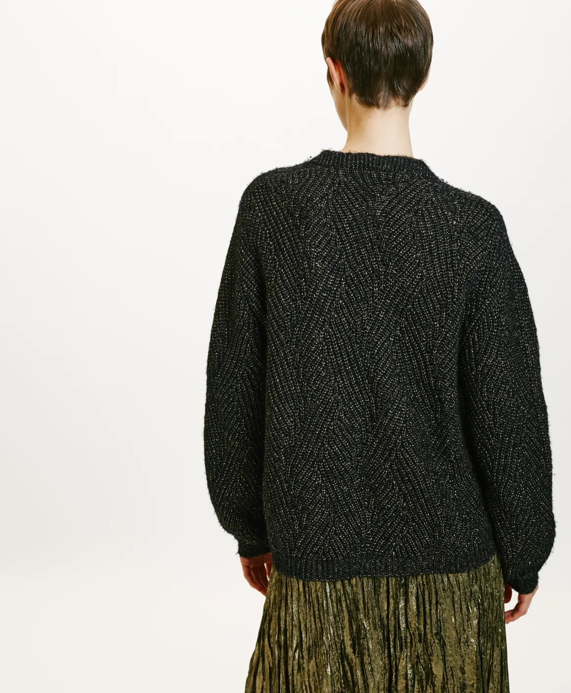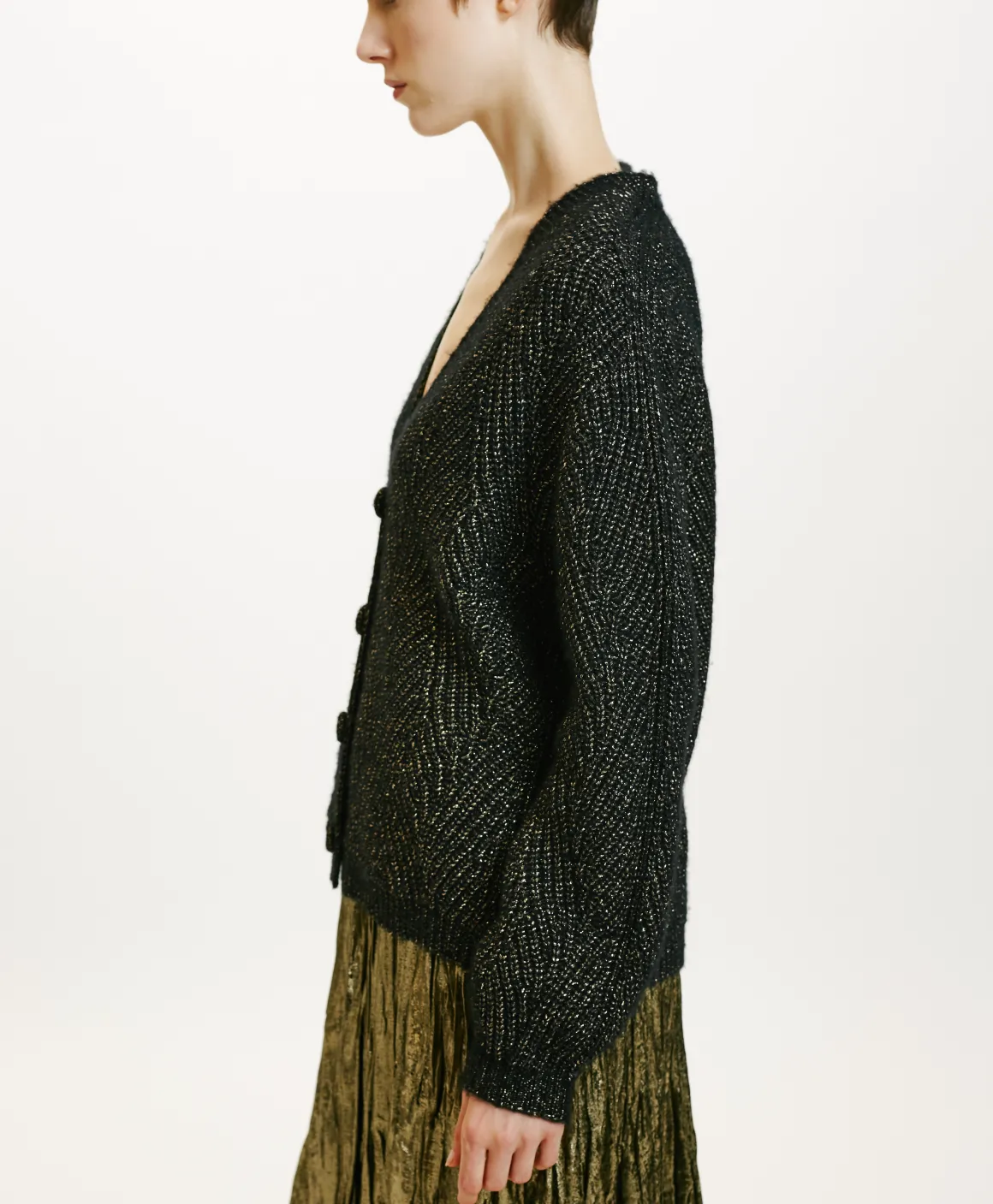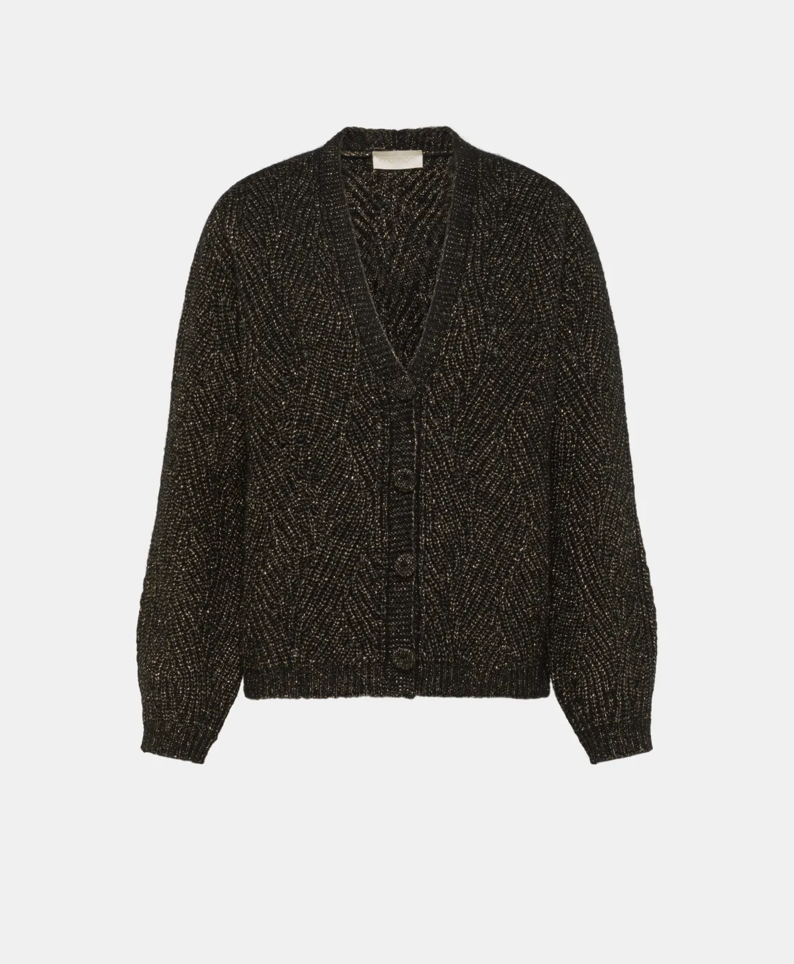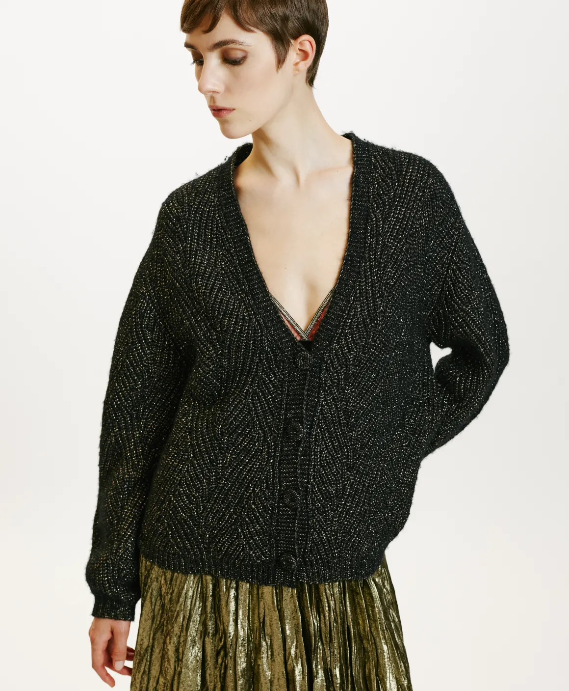 Cardigan effetto boxy in filato lana Vergine. Maniche lunghe, scollattura a “v”, senza bottoni con rifinitura a coste sul fondo. Particolare lavorazione a treccia con un tocco di lurex.
