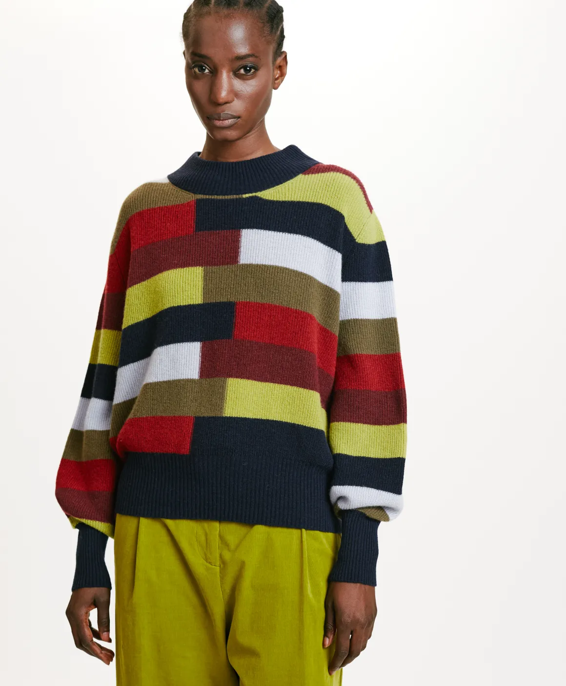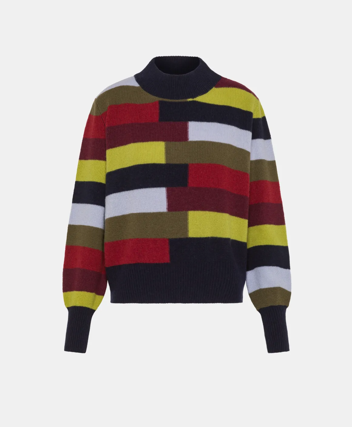 Maglia in misto lana sostenibile, con percentuale riciclata, collo montante e motivo di righe multicolor sfalsate. Manica lunga con polsi e fondi monocolore. Made in Italy.