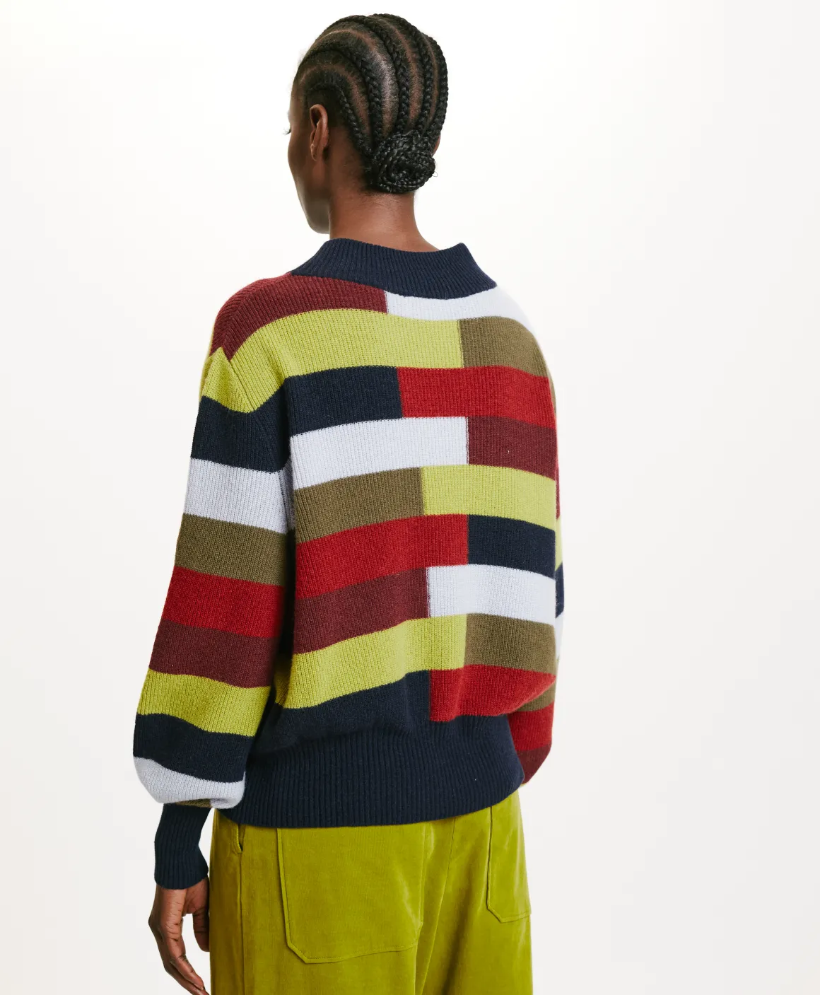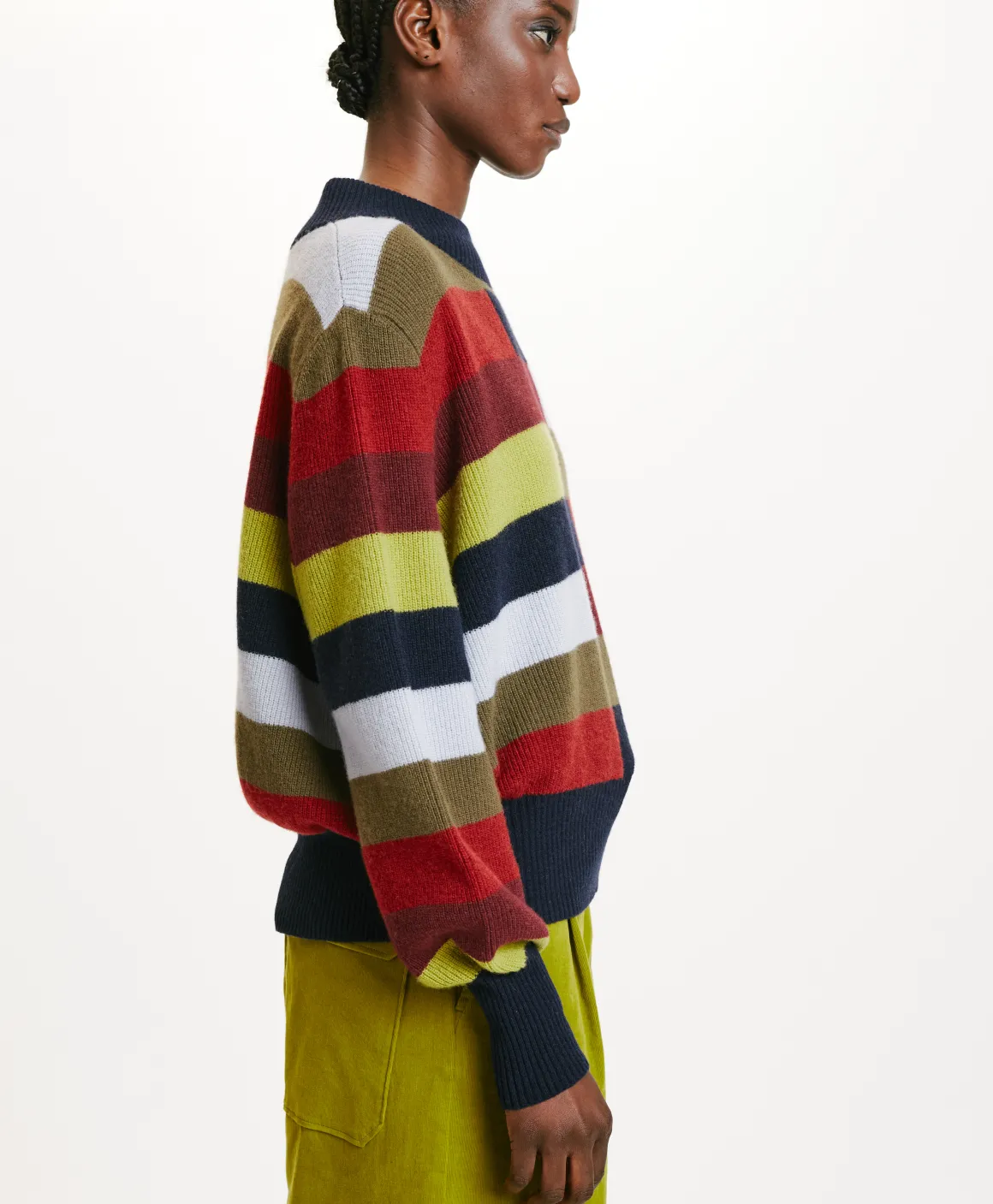 Maglia in misto lana sostenibile, con percentuale riciclata, collo montante e motivo di righe multicolor sfalsate. Manic…