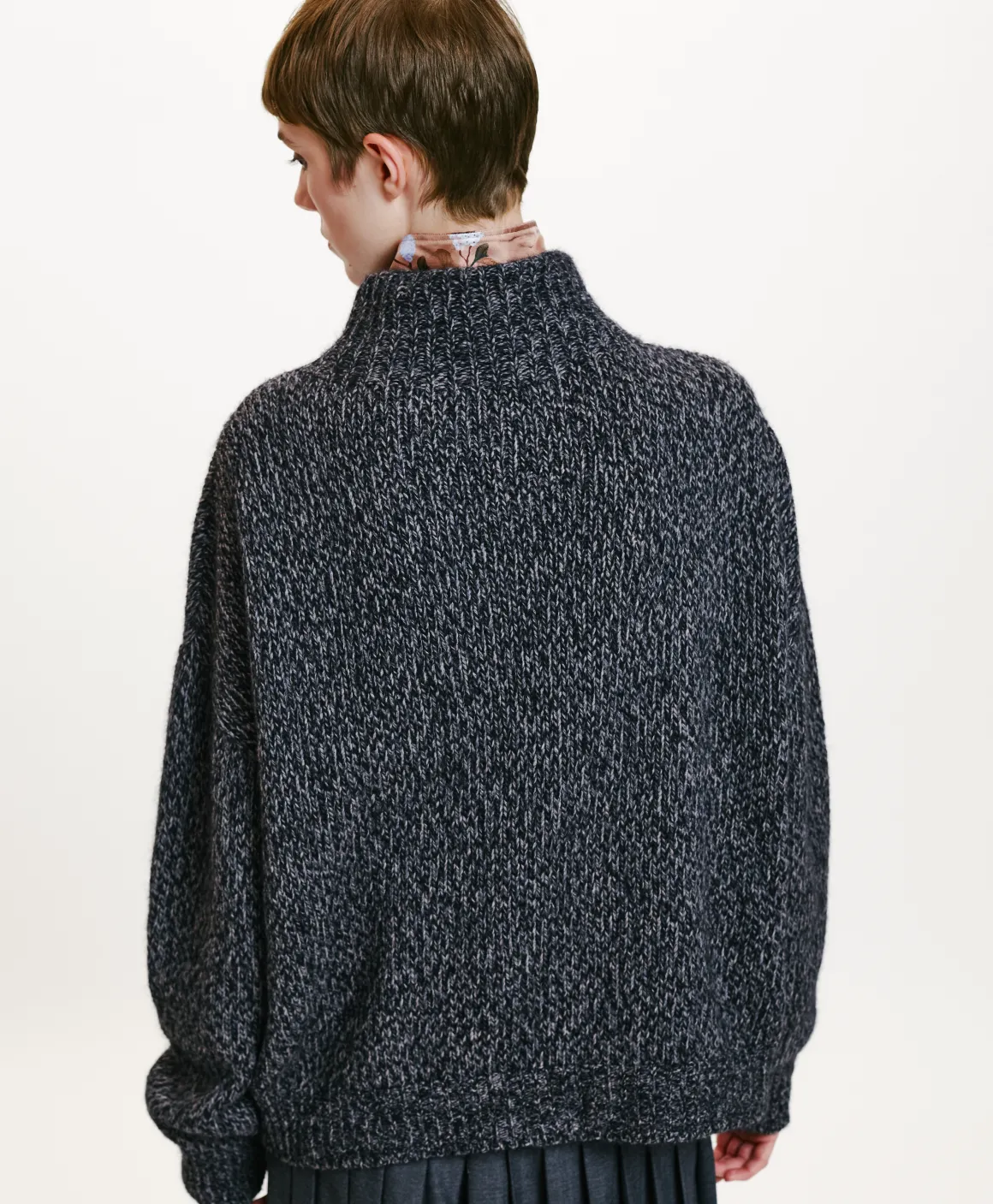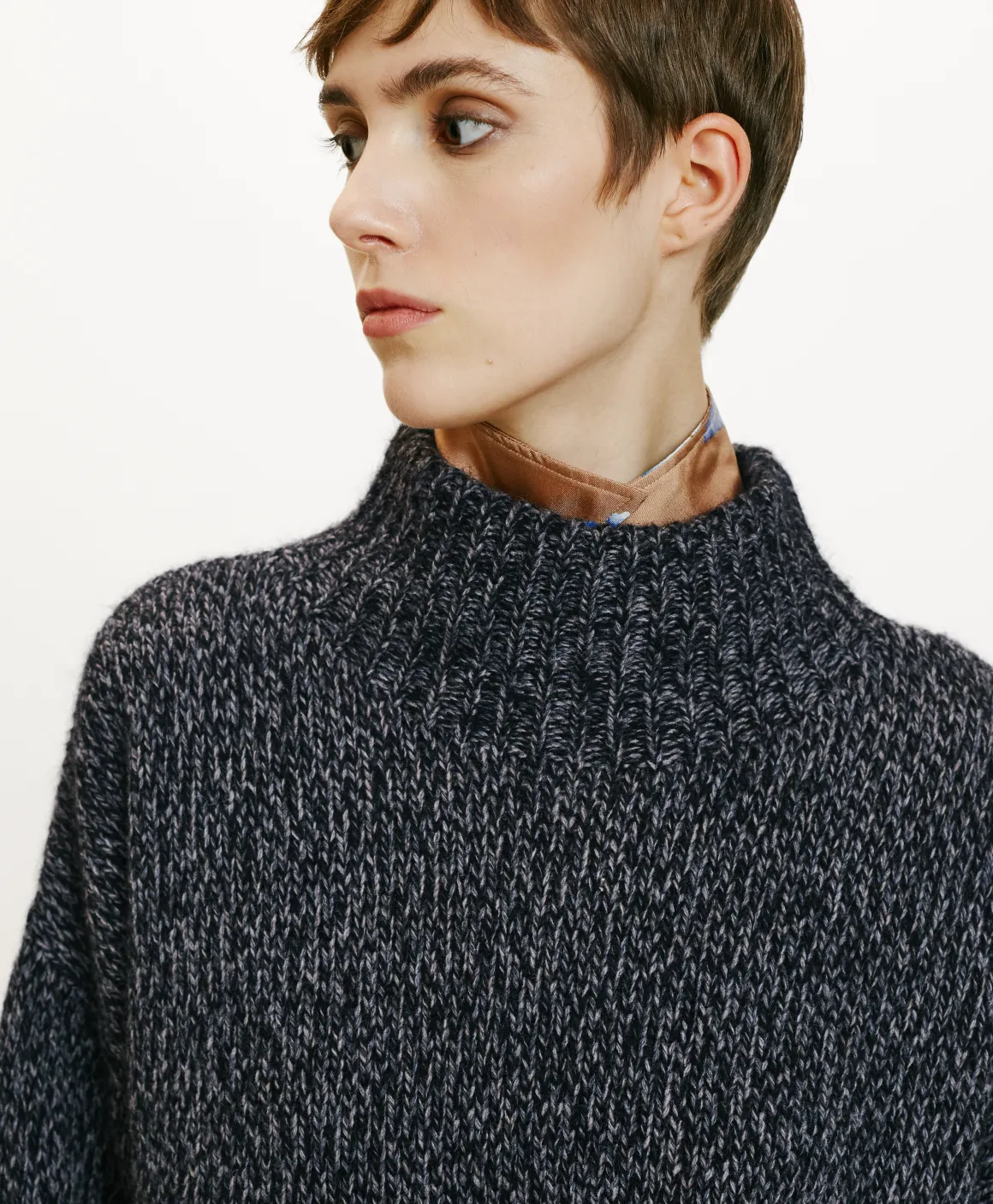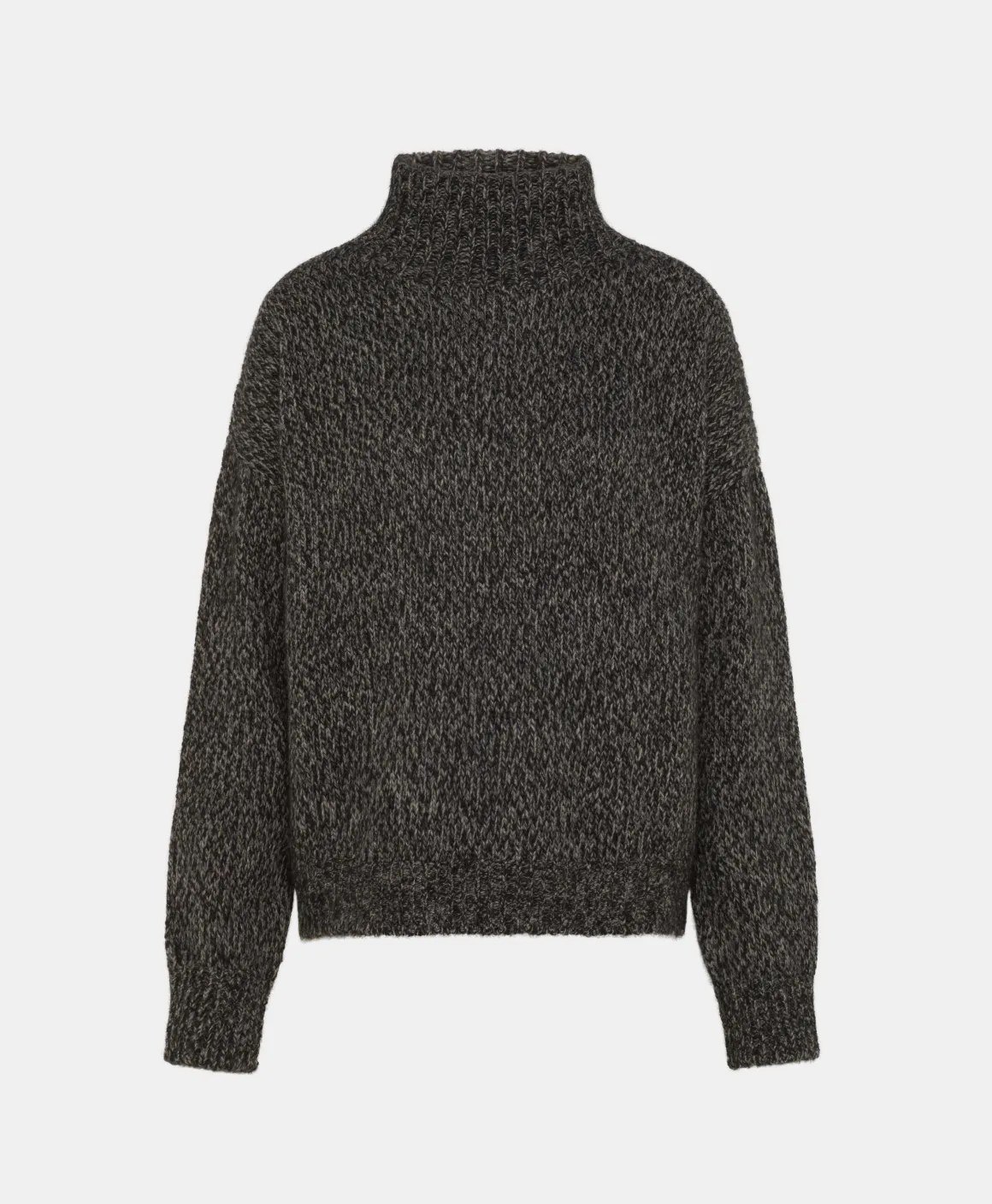 Maglia in misto lana , effetto moulinè. Collo alto, maniche lunghe dalla vestibilità morbida. Made in Italy