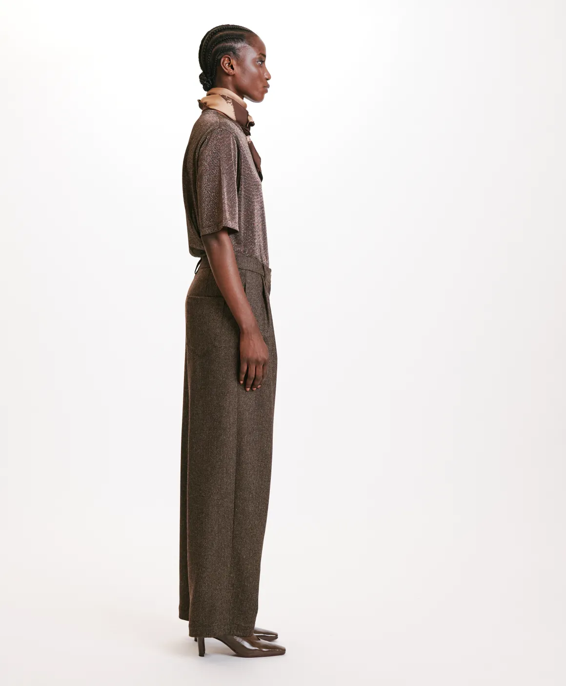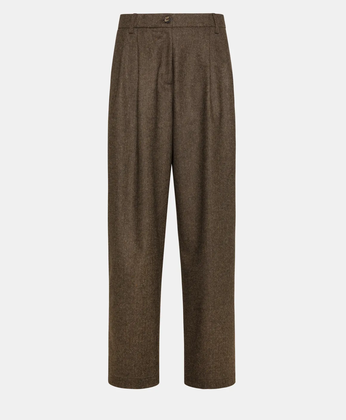 Pantalone in chevron bicolore di misto lana, con pieghe sul davanti che donano ampiezza alla gamba, cavallo sceso e fit rilassato. Abbottonatura a vista, tasche alla francese e passanti per cintura in vita.