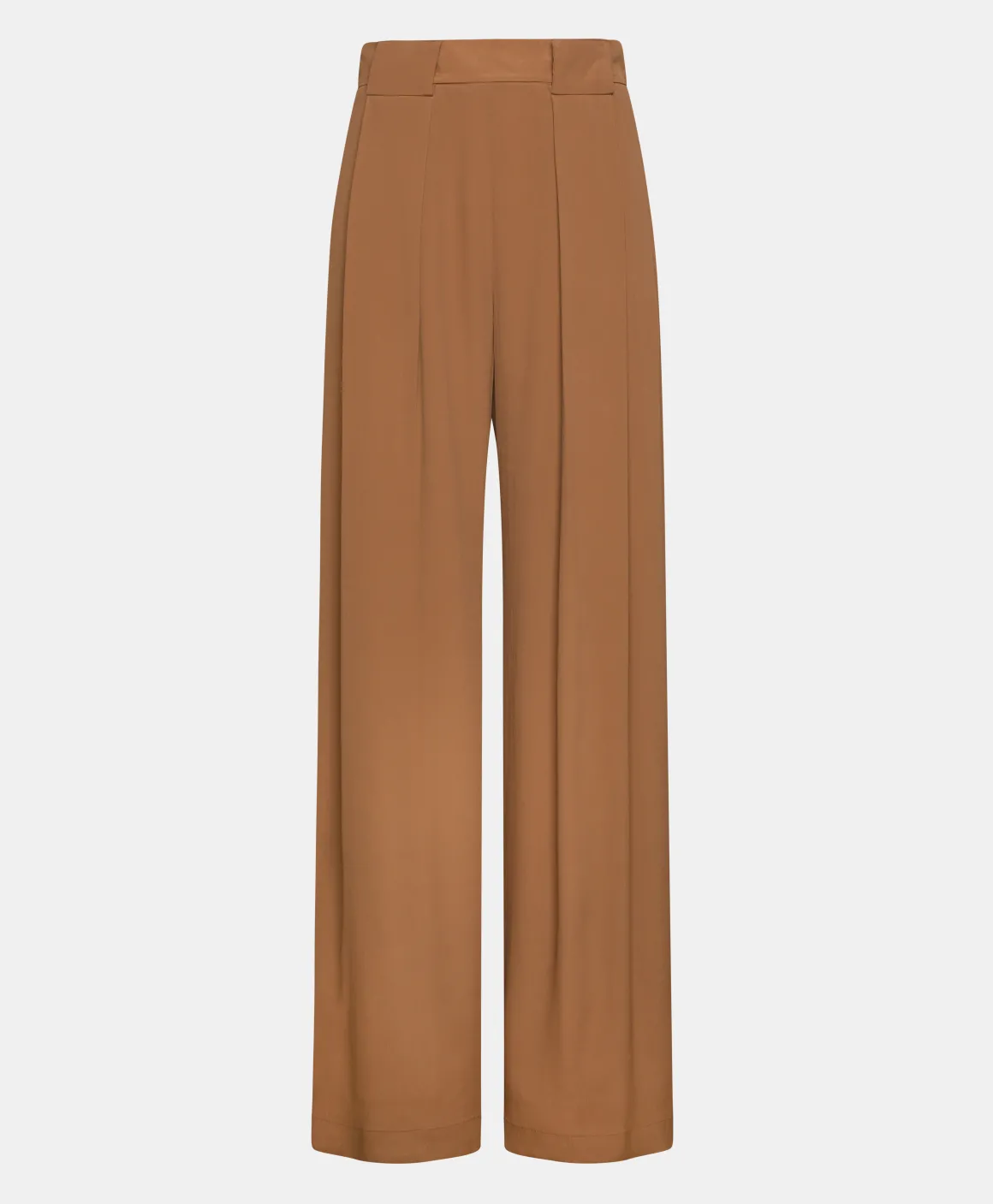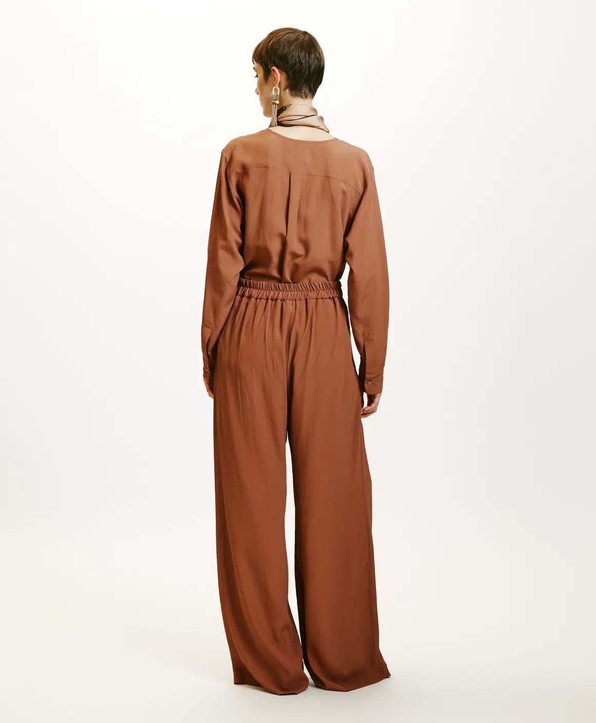 Pantalone in crepe misto seta carry-over, a palazzo, dalla linea ampia e ariosa. Pieghe frontali bloccate da maxi passanti, tasche inserite nel fianco e cintura elasticata sul retro.