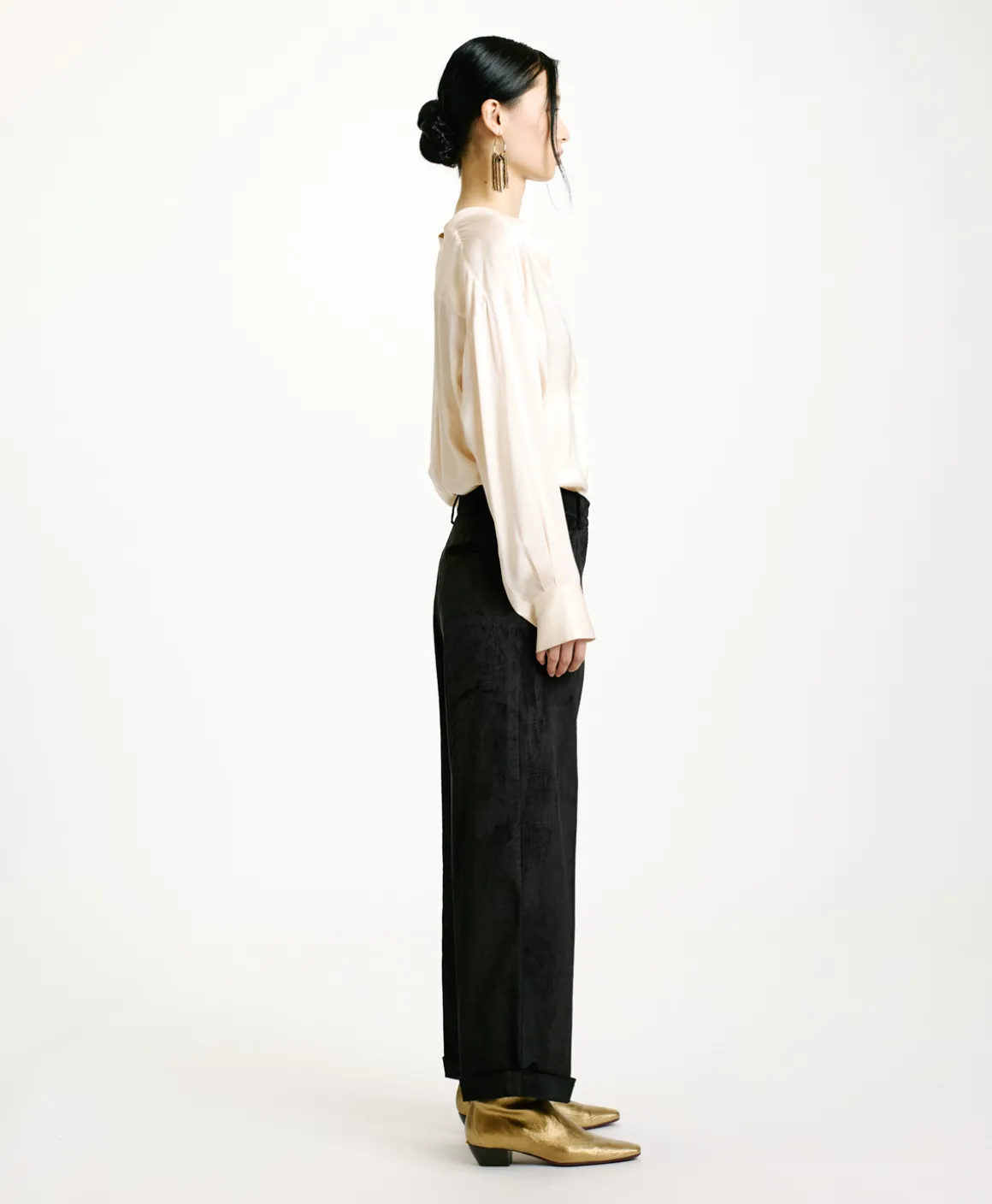 Pantalone lunghezza cropped con risvolto in confortevole velluto a coste stretch leggermente lucido. Dalla linea sartoriale, con gamba dritta e stiro in piega, “Dango” è un pantalone pass partout.
