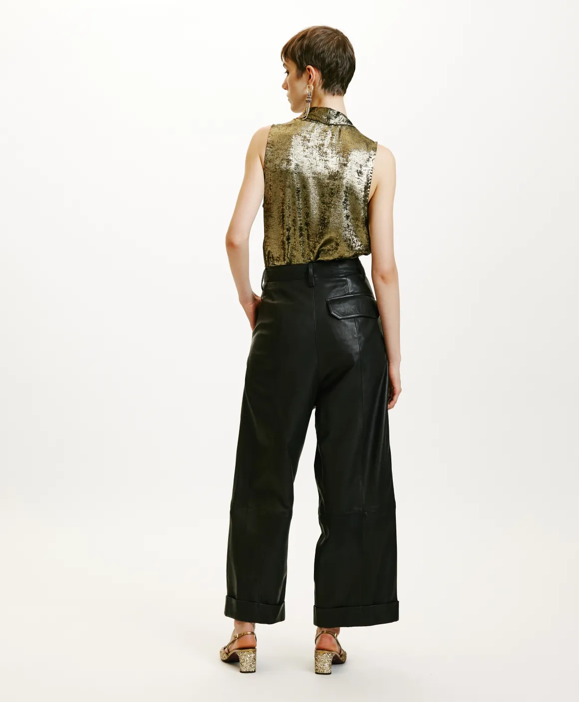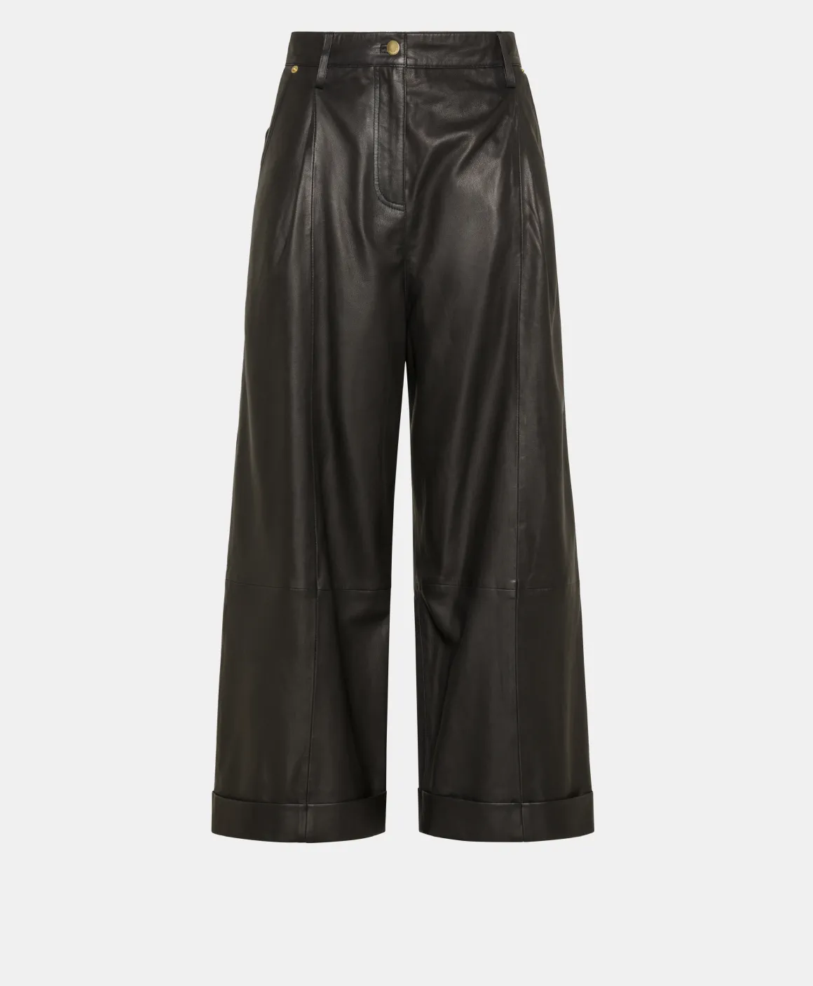 Pantalone carry over Momonì, a gamba larga in morbida pelle nappa. La linea scultorea è enfatizzata da pinces profonde e lunghezza crop, con risvolto sul fondo. Davanti tasche alla frances, abbottonatura a vista e zip.