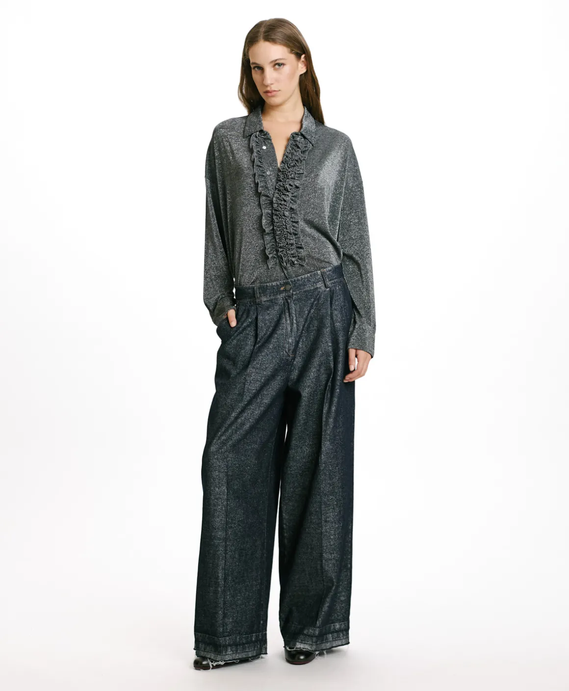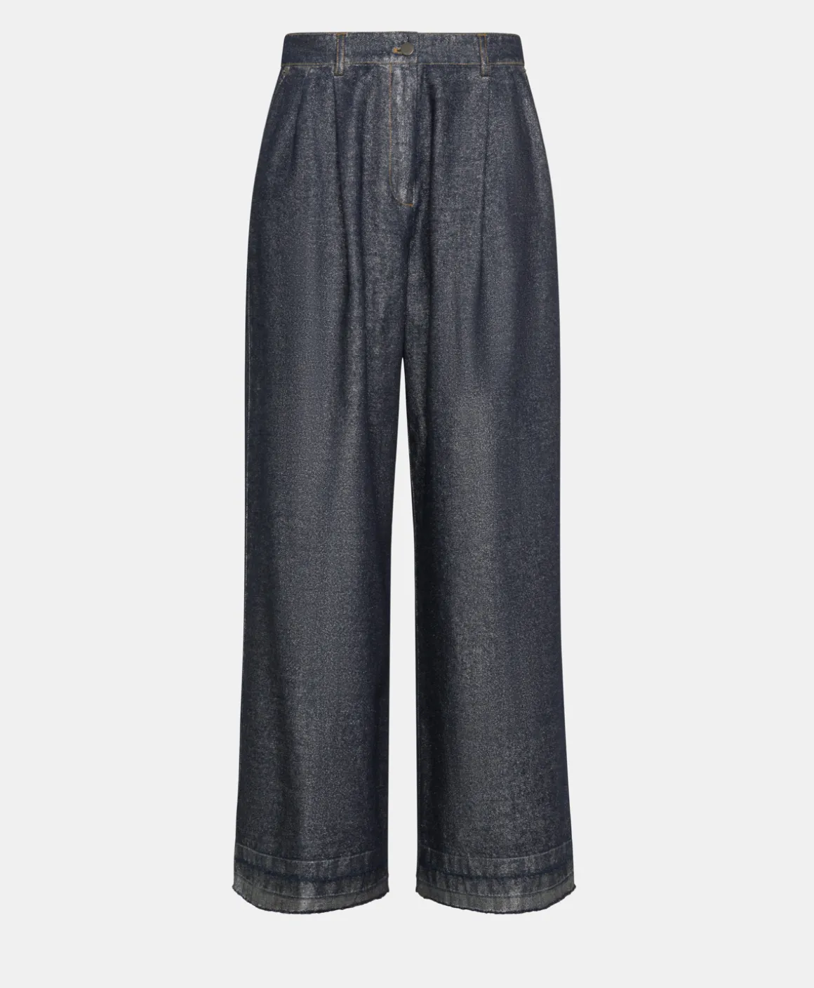 Pantalone lungo gamba ampia in denim di cotone con laminatura. Fit rilassato ma elegante, con pinces sul davanti e tasch…