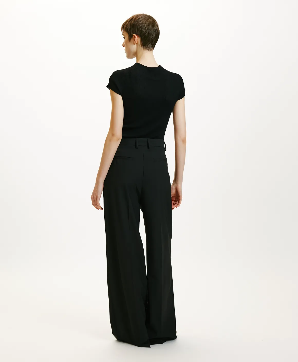 Pantalone lungo gamba ampia in fresco di lana bi-stretch. Fit rilassato ma elegante, con pinces sul davanti e tasche inserite sul fianco. Cinturino costruito con passanti, apertura con zip e bottone.