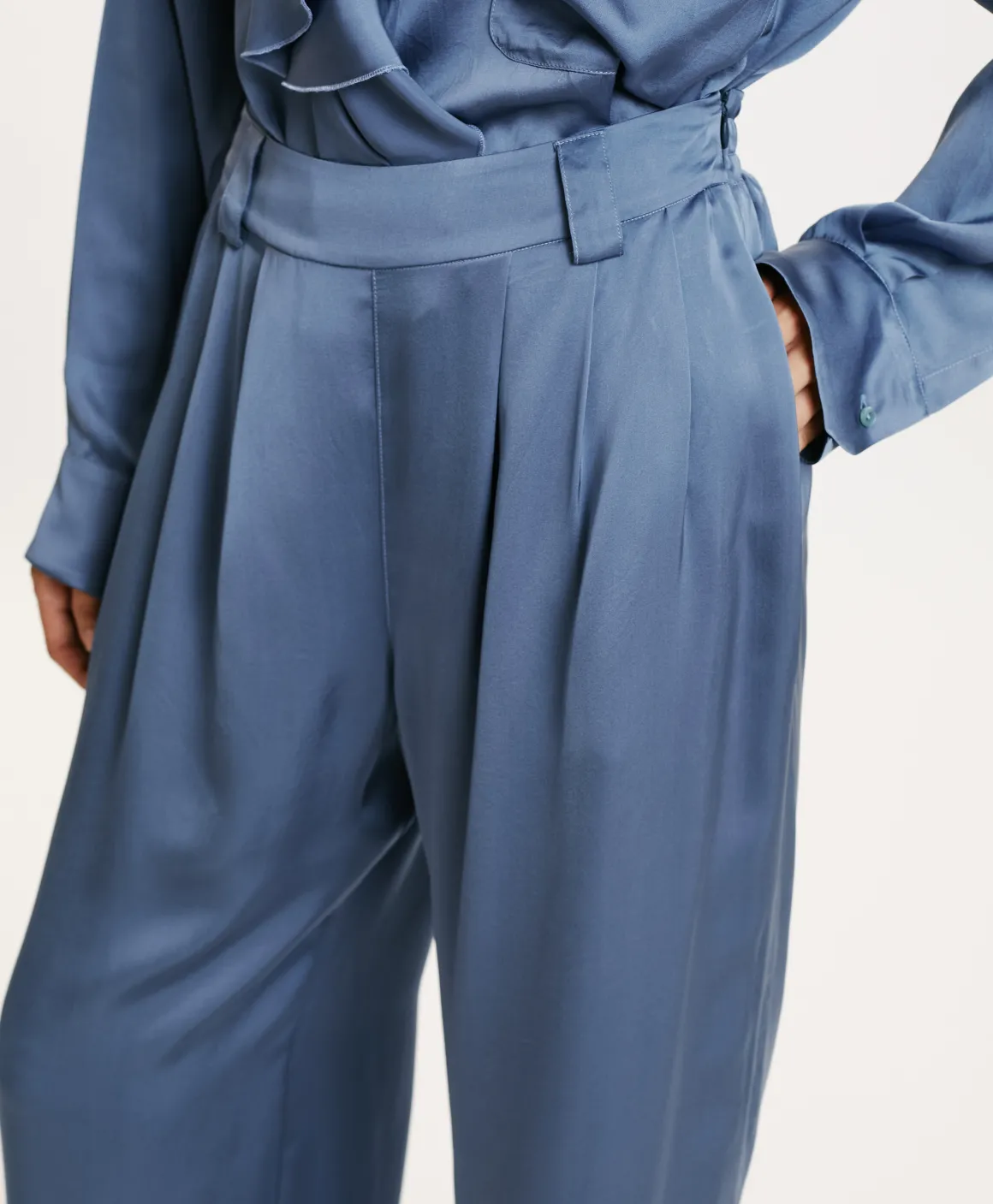 Pantalone in pura seta lavata. La silhouette di Lanzarote, ormai un’icona Momonì, è ampia e ariosa, con pieghe frontali e tasche. Presentato nella sua versione con cinturino costruito e zip sul fianco.