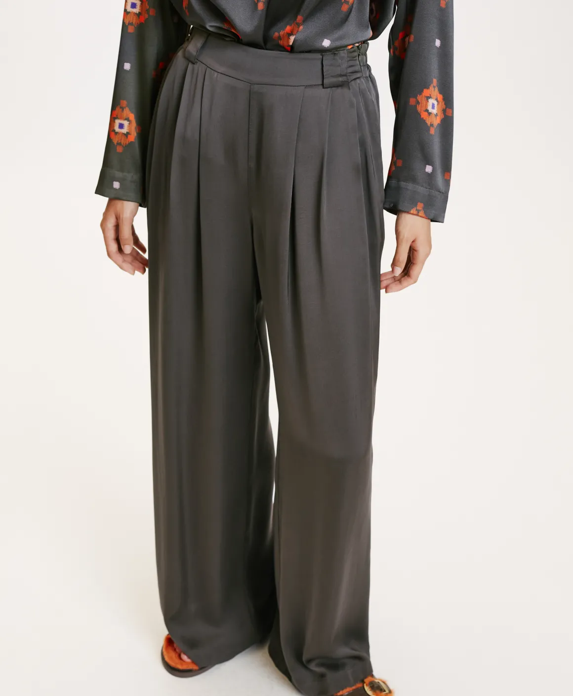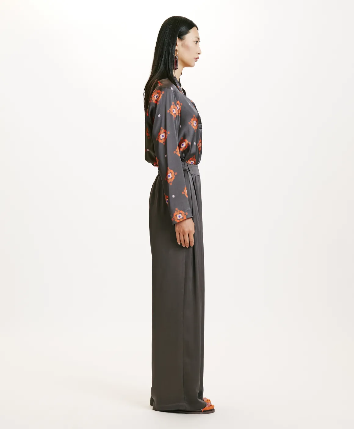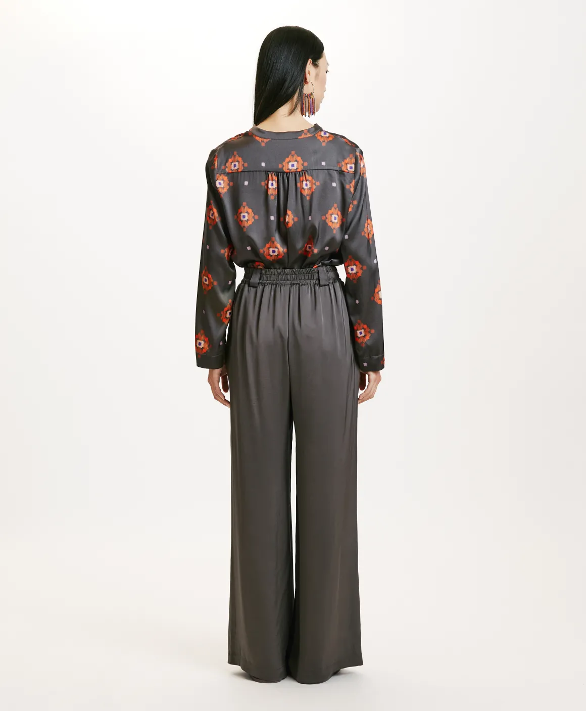 Pantalone in pura seta lavata. La silhouette di Lanzarote, ormai un’icona Momonì, è ampia e ariosa, con pieghe frontal…