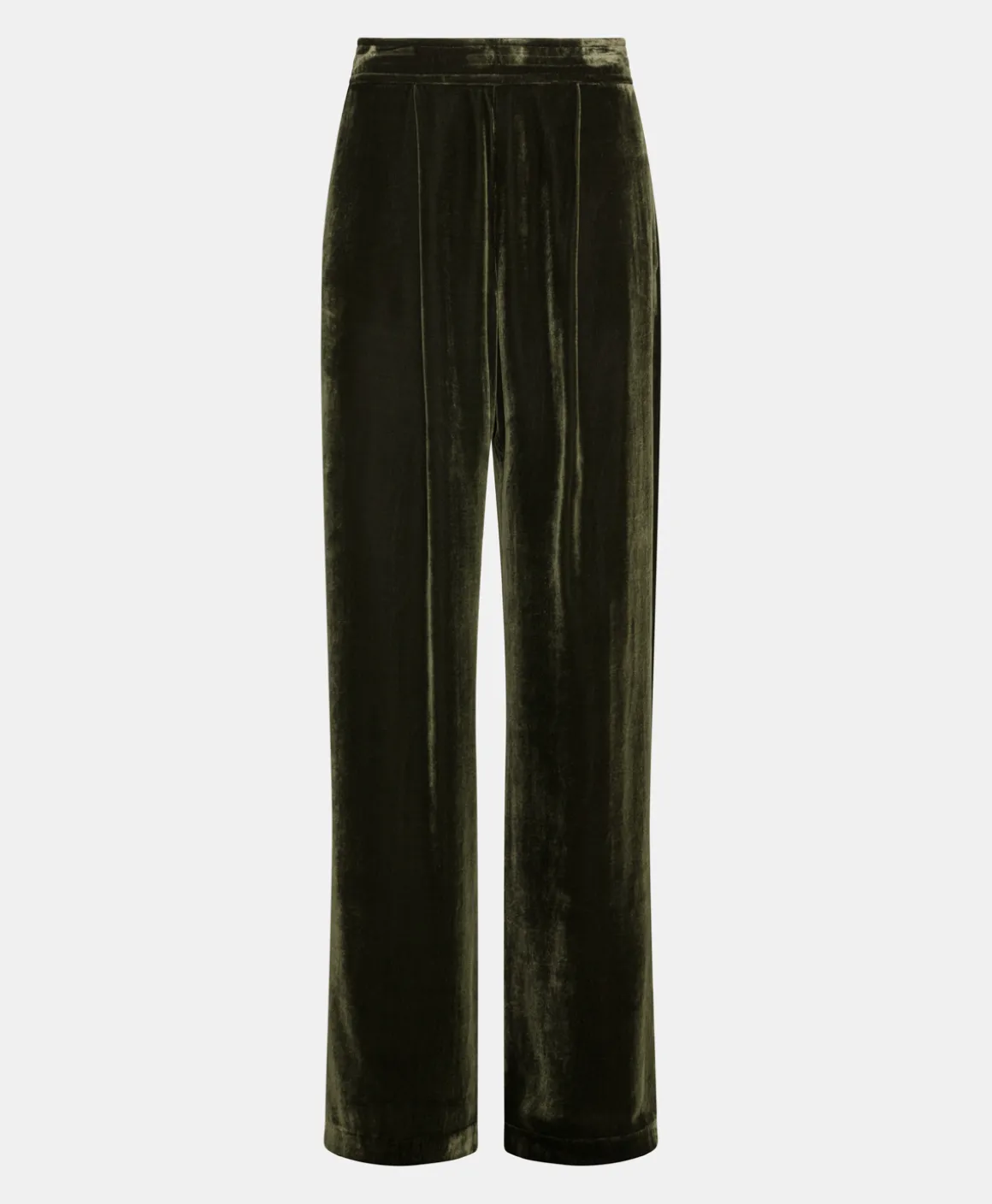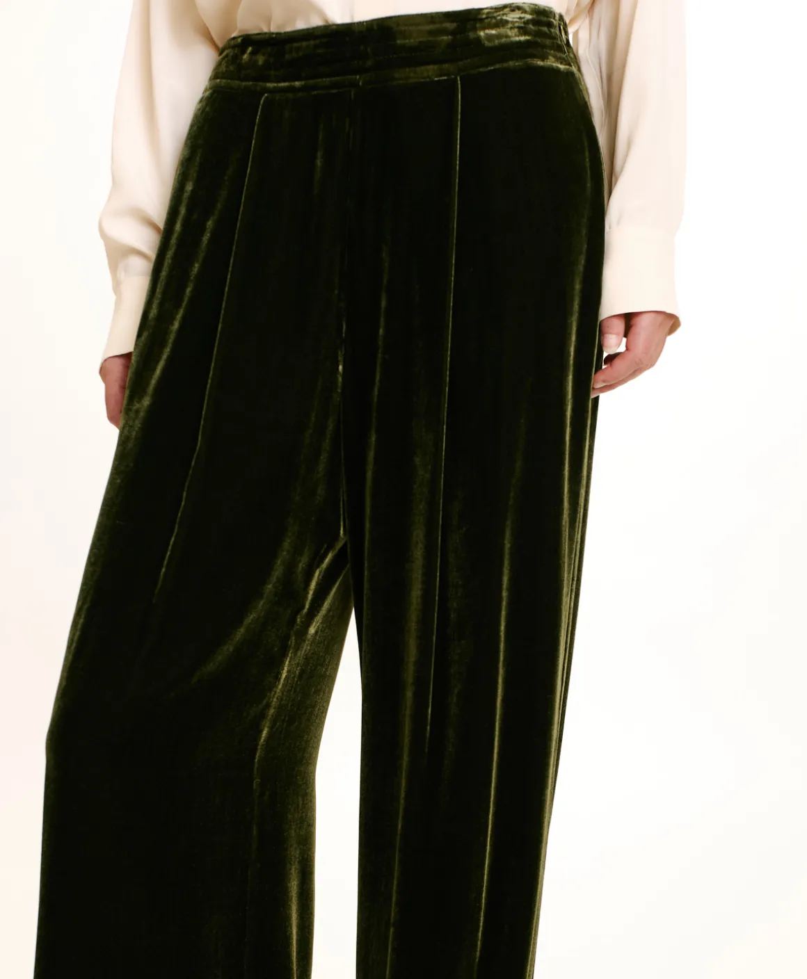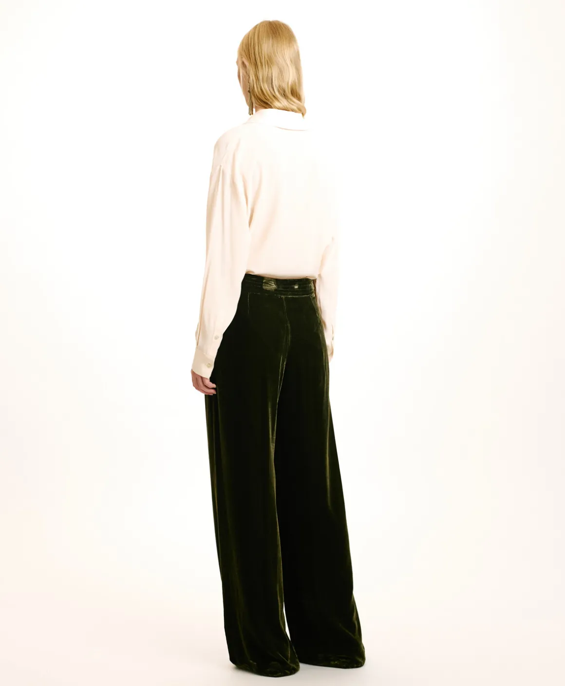 Pantalone lungo fluido in prezioso velluto di seta e viscosa. Ampia gamba con profonde pieghe centrali, cinturino alto con dettaglio cuciture multiple e apertura con zip. Tasche davanti inserite nel fianco.