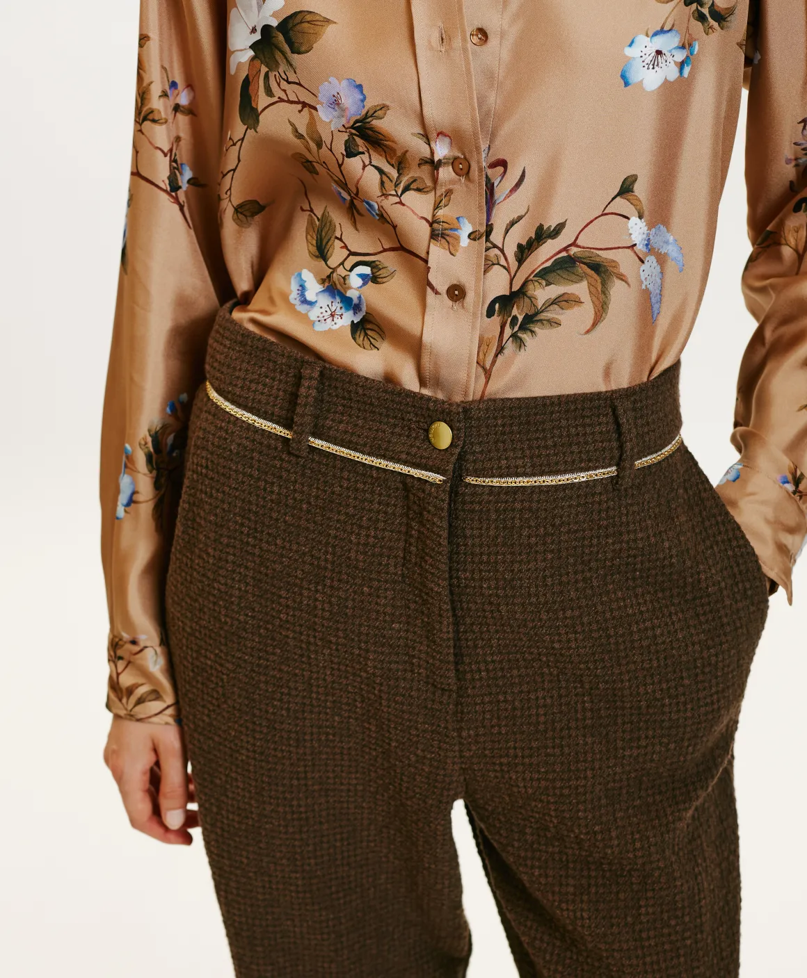 Pantalone lungo gamba dritta in morbida lana stretch pied de poule aspetto seersucker. Vita leggermente alta, cinturino costruito con piping inserito sul taglio, apertura con bottone e zip, tasche alla francese.