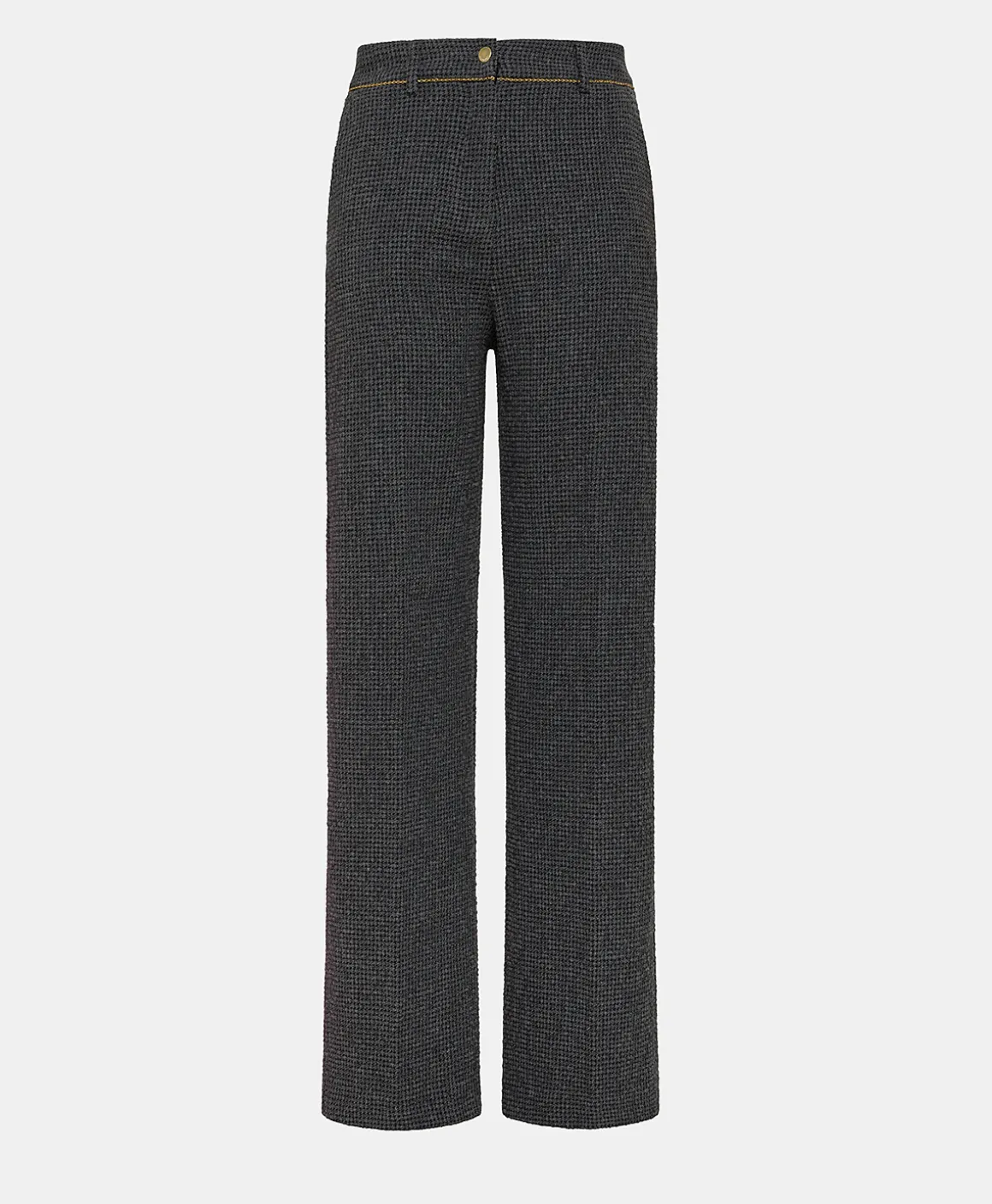 Pantalone lungo gamba dritta in morbida lana stretch pied de poule aspetto seersucker. Vita leggermente alta, cinturino costruito con piping inserito sul taglio, apertura con bottone e zip, tasche alla francese.