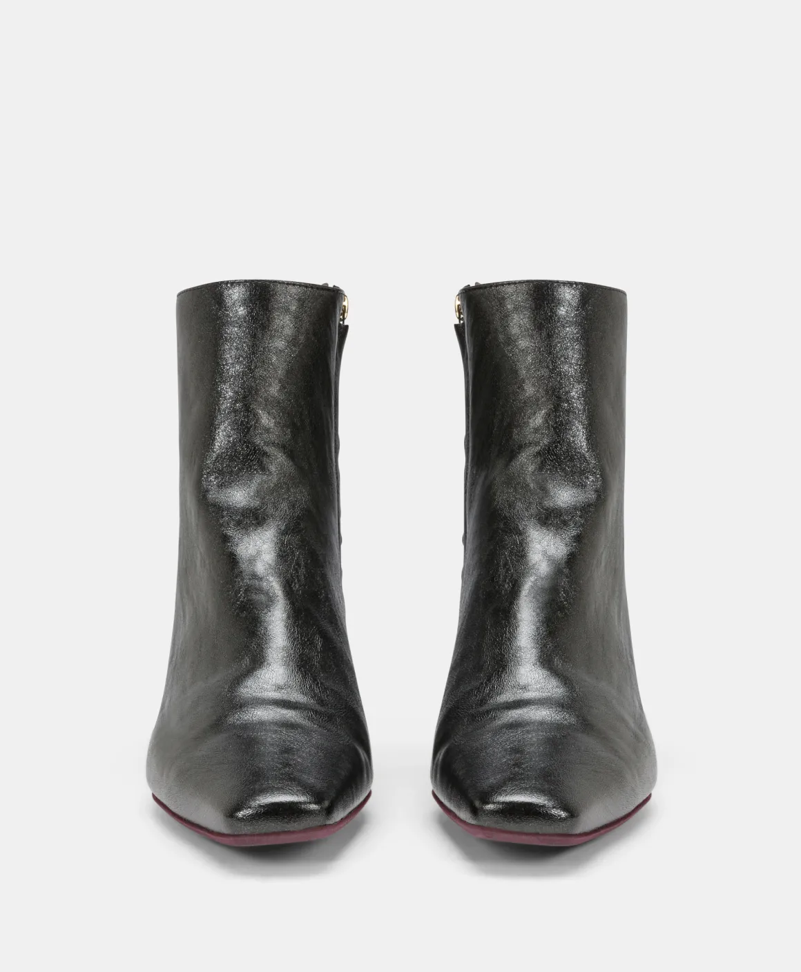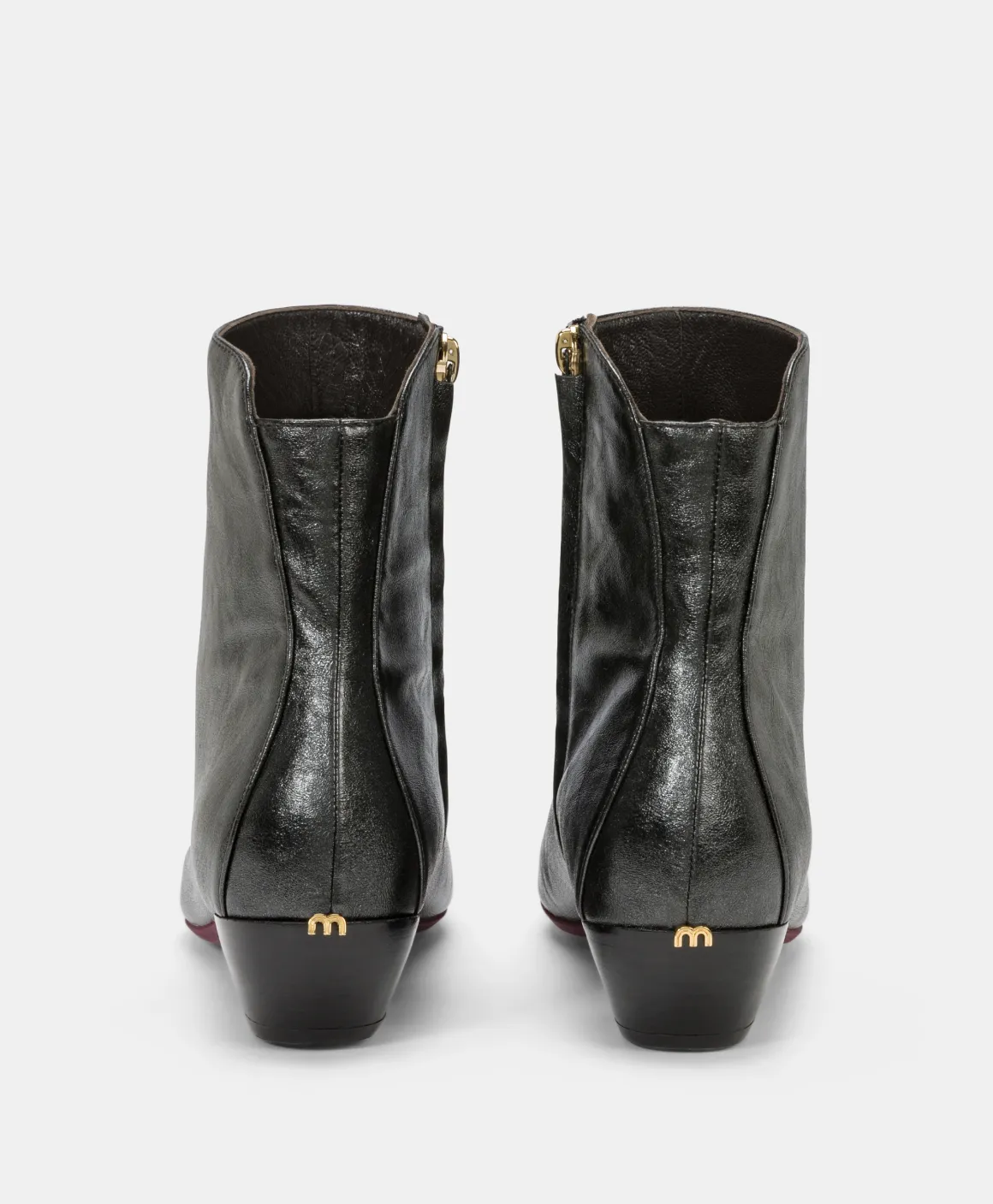 Stivaletto alla caviglia in ecopelle laminata, dall’allure rock, con linea arrotondata del gambale che sale nel davanti. Grintosa punta allungata, dolcemente squadrata, e tacchetto dalla base larga. Apertura con zip laterale nascosta da labbrino, suola colorata e raffinato dettaglio M dorato in corrispondenza dell’attaccatura tacco dietro.