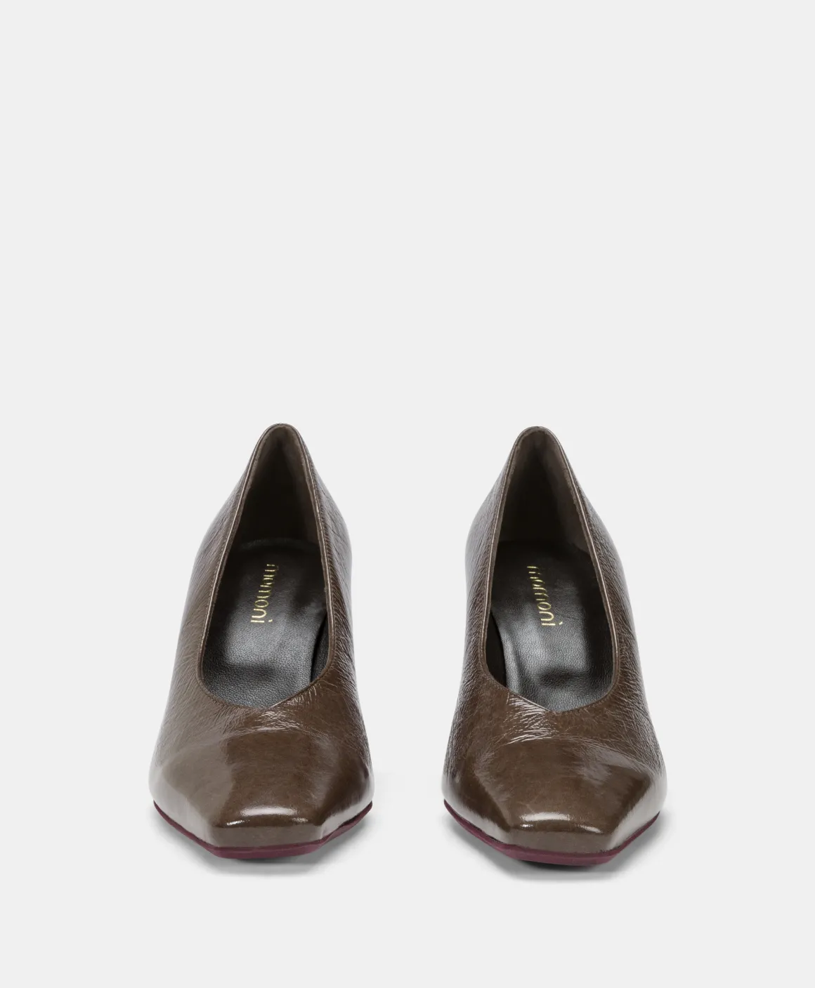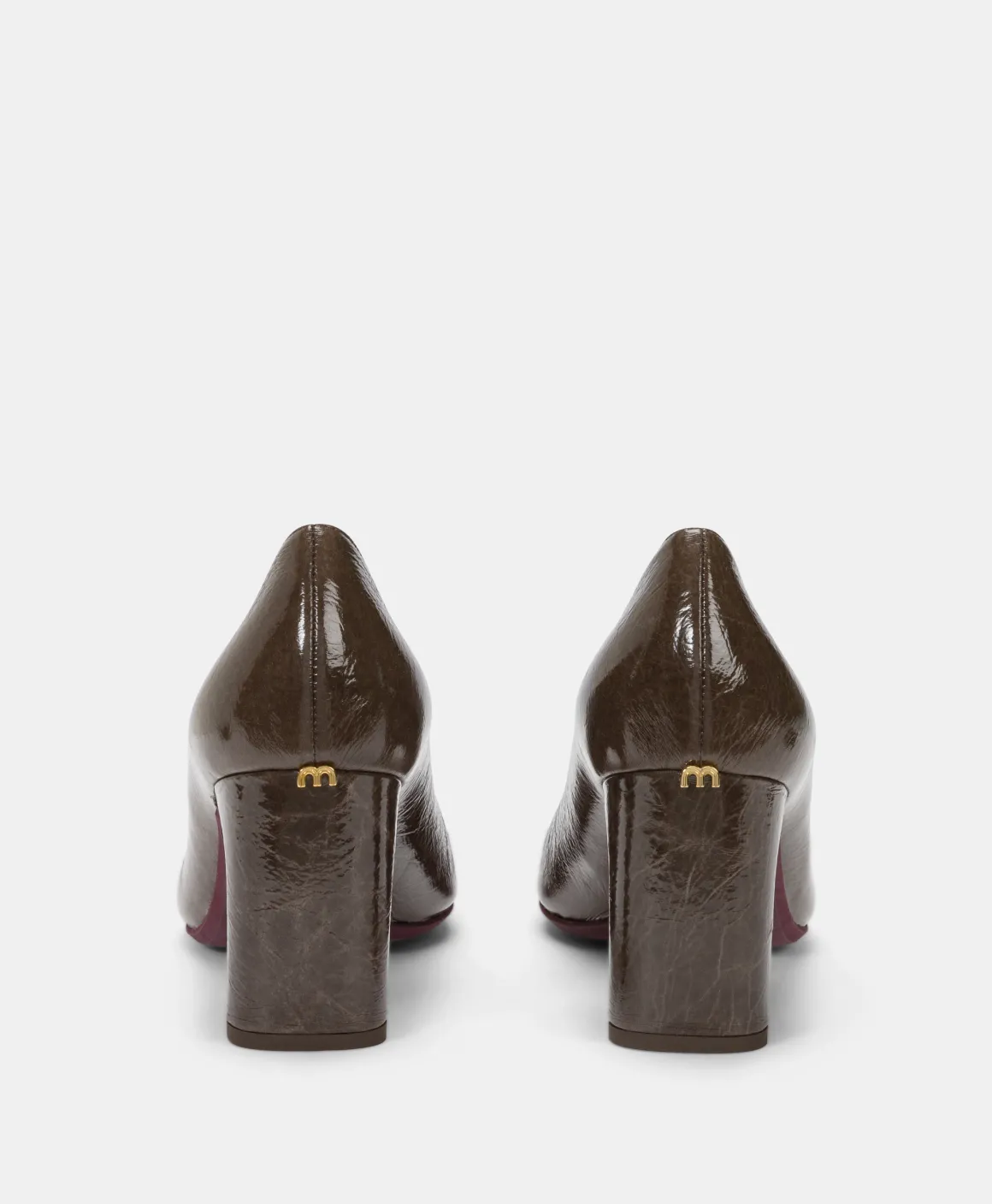 Scarpa pump con comodo tacco alto in moderna pelle naplack, con punta dolcemente squadrata e profonda scollatura a v sul collo del piede. Suola colorata e raffinato dettaglio M dorato in corrispondenza dell’attaccatura tacco dietro.