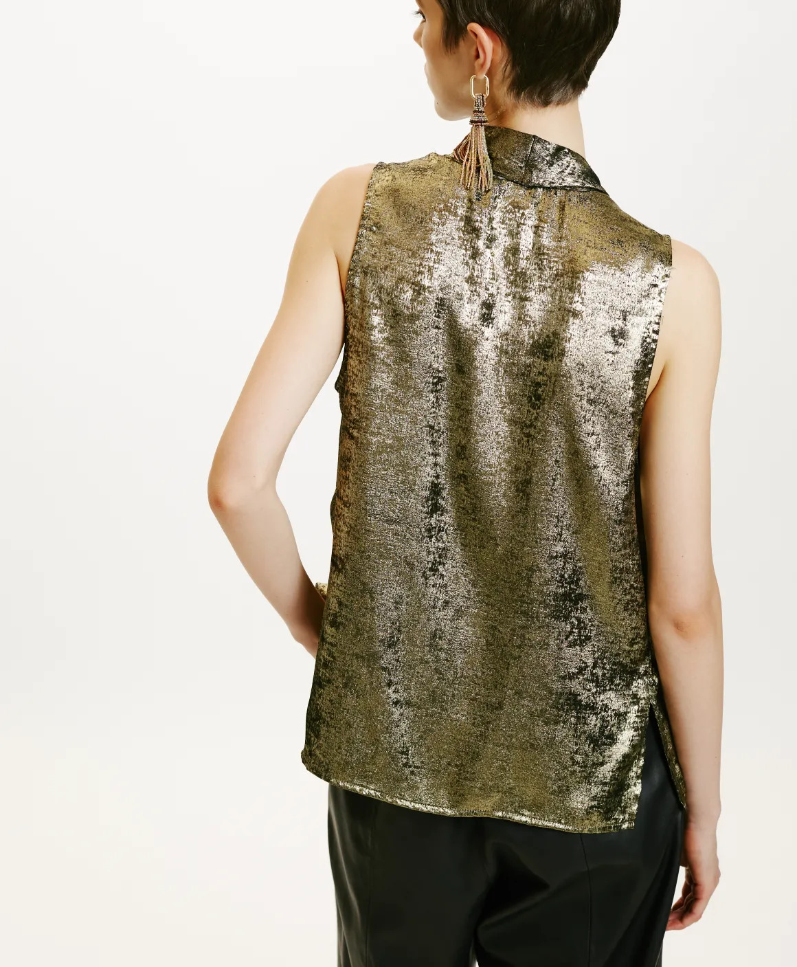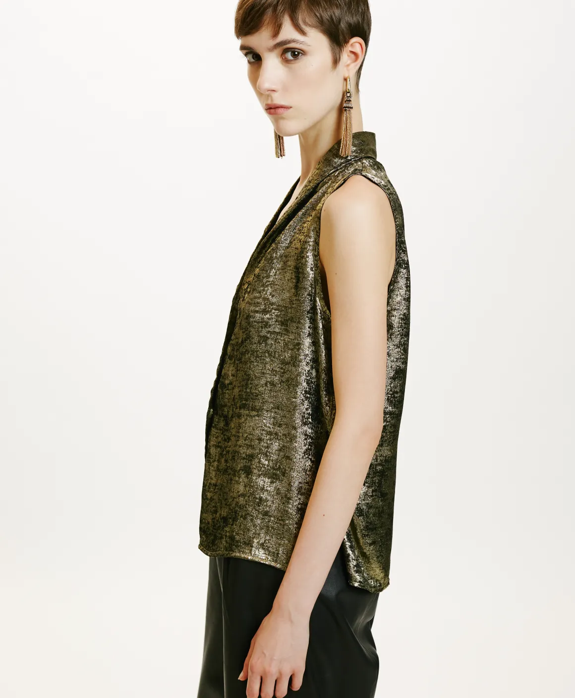Top senza manica spalla larga in tessuto fluido laminato. “Kiri” presenta uno scollo a v dettagliato da pieghe, abbott…