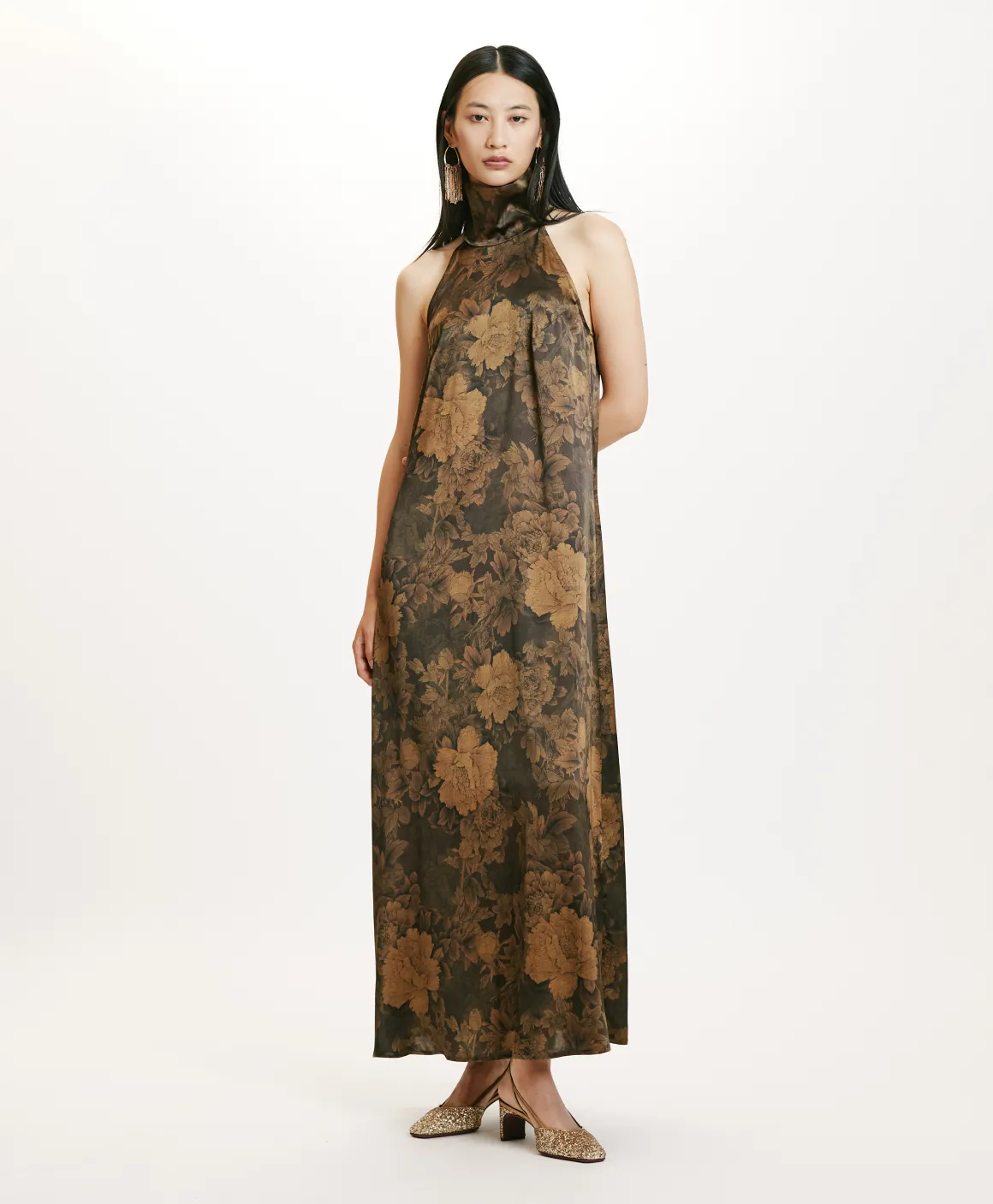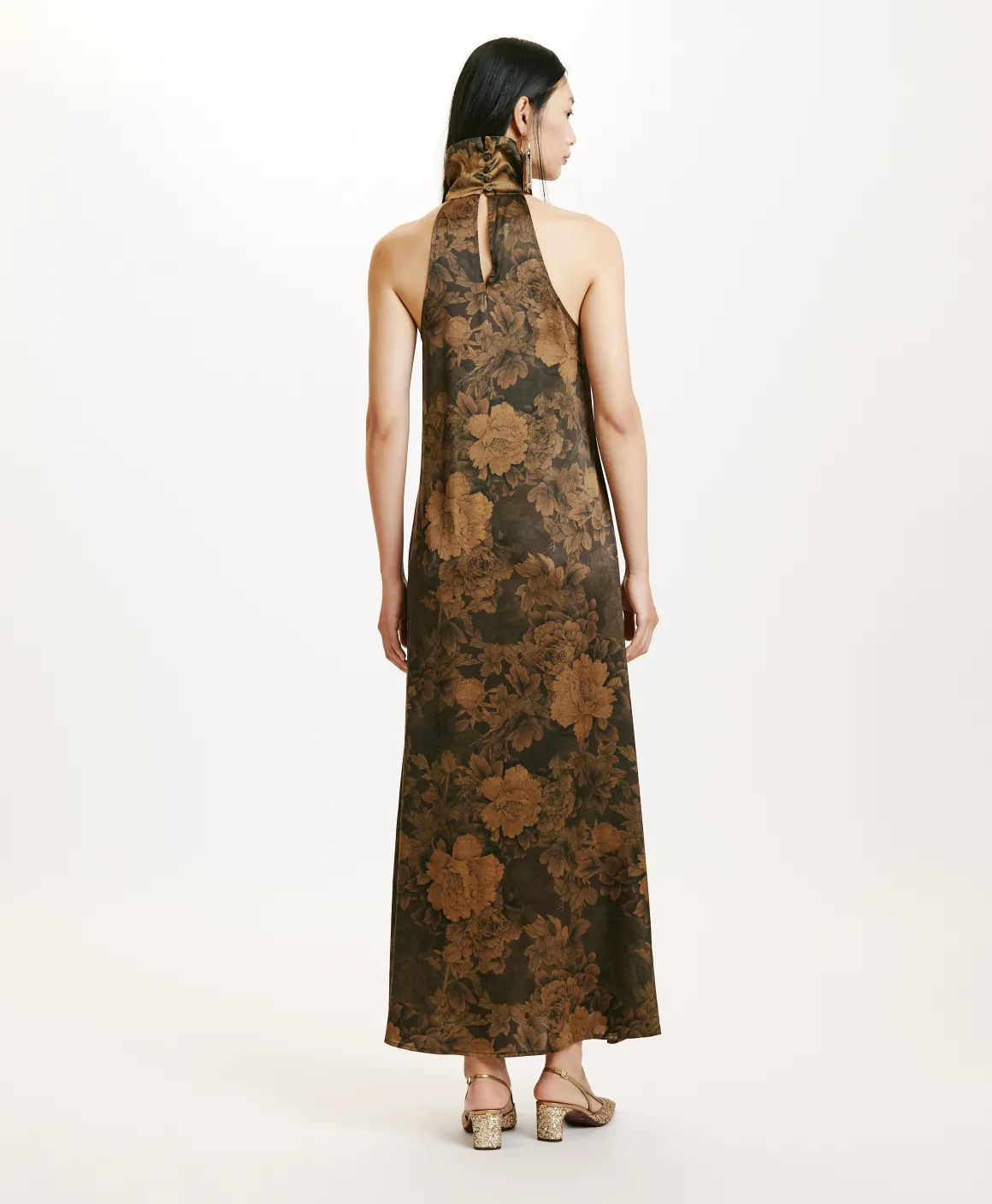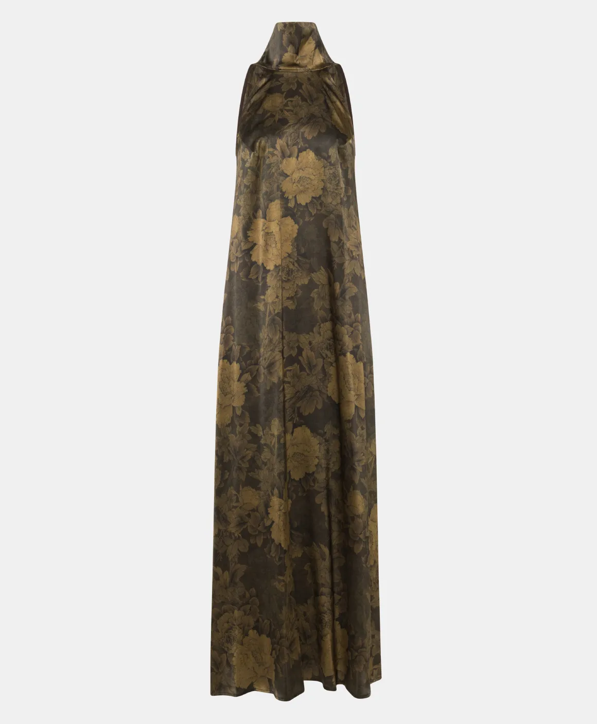 Abito lungo smanicato in raso di seta stretch stampato. Linea all’americana per il giromanica e collo alto a ciambella, con apertura a goccia sul dietro. Ideale per cocktail e serate autunnali, in abbinata a caldi blazer, cardigan o cappotti.