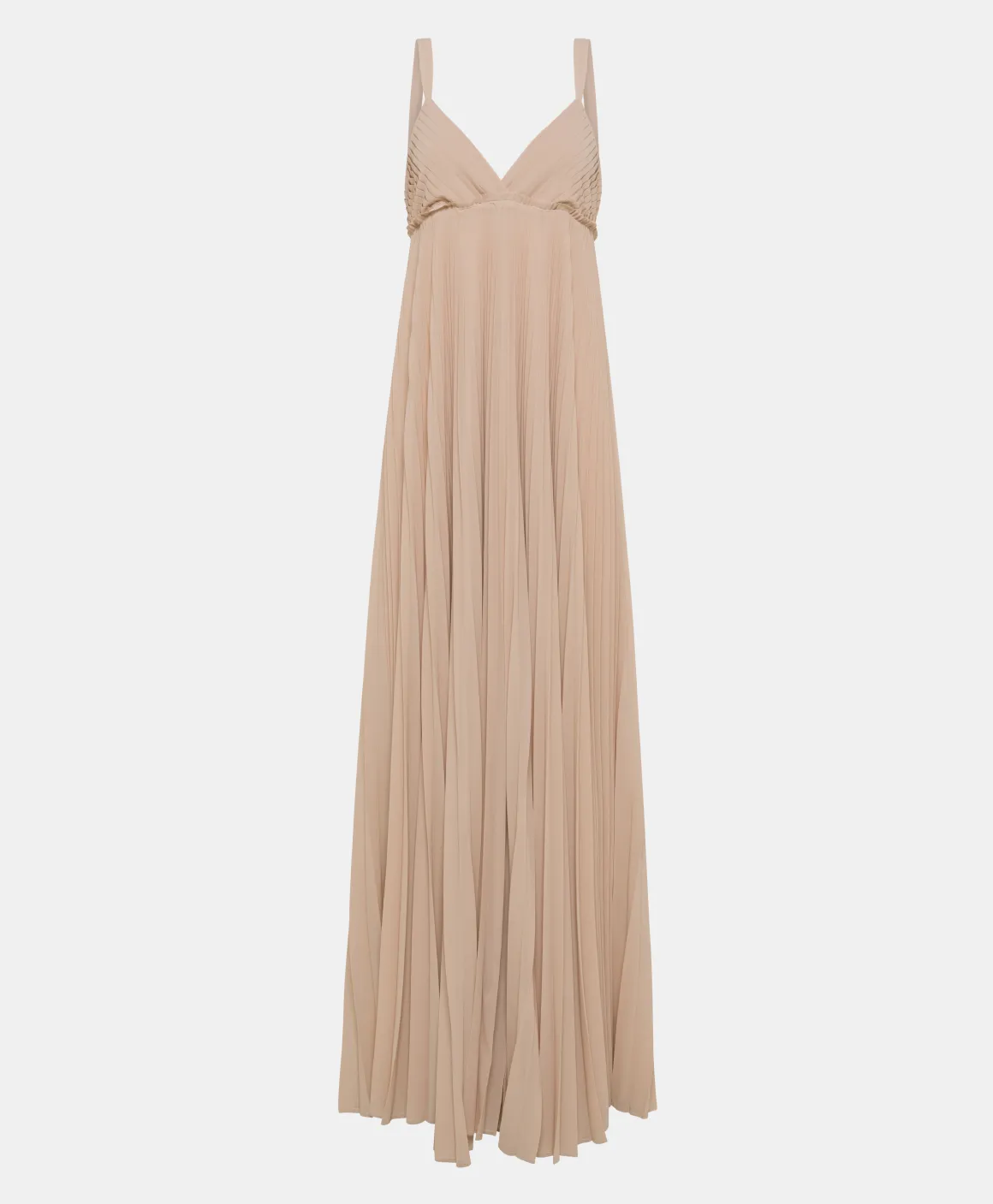Abito lungo con coppe a triangolo con lavorazione a micro pieghe plissettate piatte in georgette. Scenografica gonna, anch’essa interamente plissettata, e spalline piatte. Corpetto con elastico e costruzione foderata.